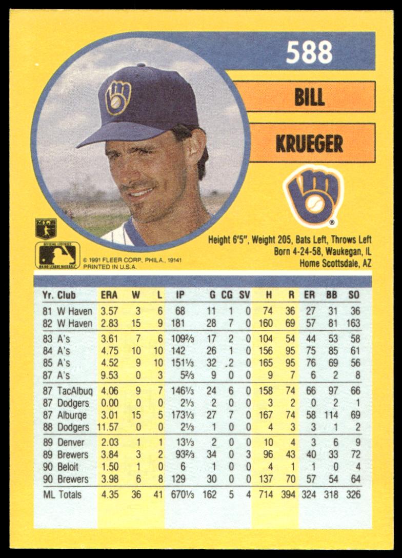 This Baseball card, from 1991 is part of the Fleer  card set. Bill Krueger is featured and has a card number of 588.