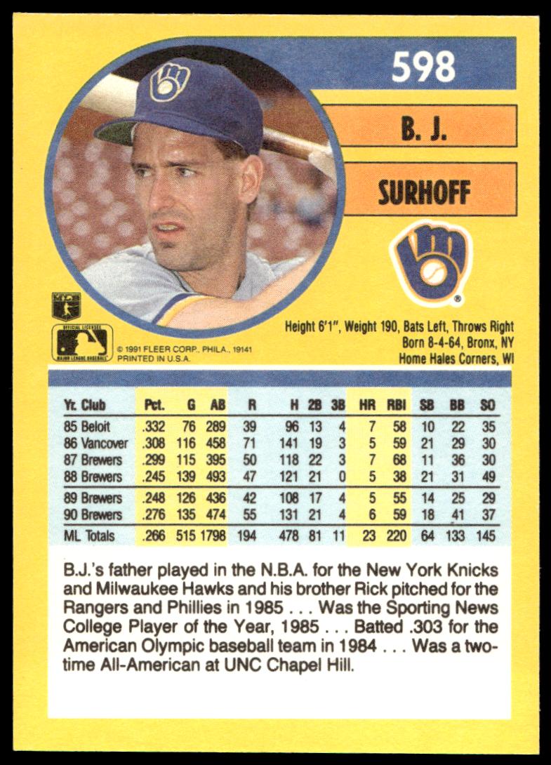 This Baseball card, from 1991 is part of the Fleer  card set. B.J. Surhoff is featured and has a card number of 598.