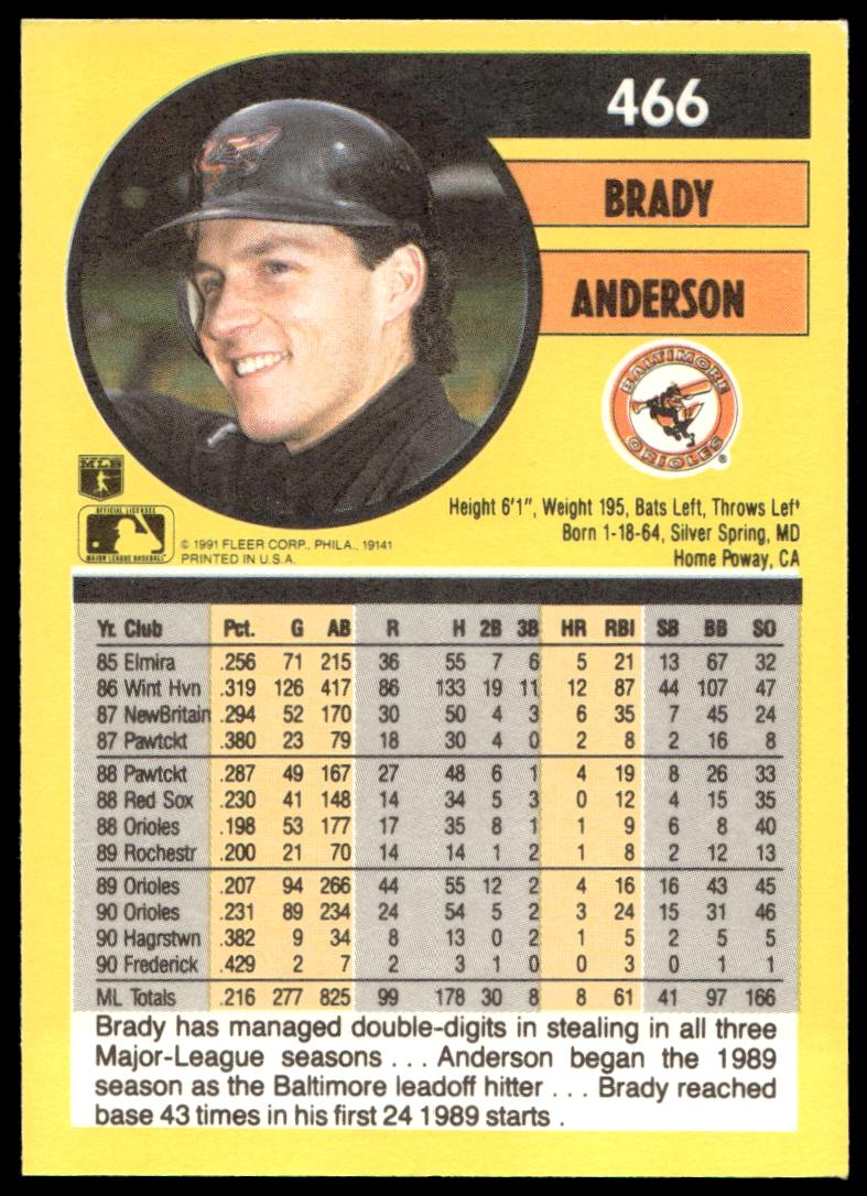 This Baseball card, from 1991 is part of the Fleer  card set. Brady Anderson is featured and has a card number of 466.