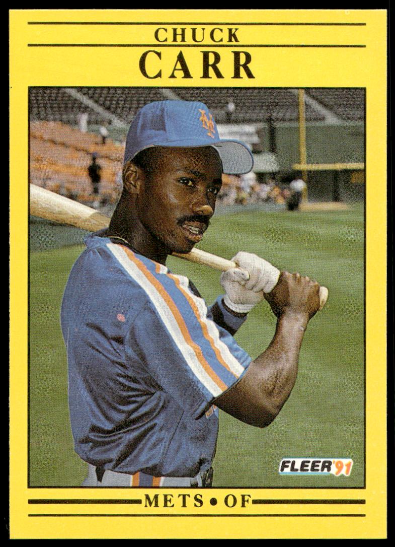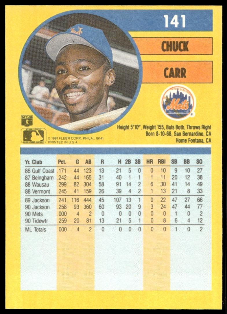 This Baseball card, from 1991 is part of the Fleer  card set. Chuck Carr is featured and has a card number of 141.