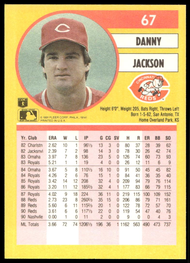 This Baseball card, from 1991 is part of the Fleer  card set. Danny Jackson is featured and has a card number of 67.