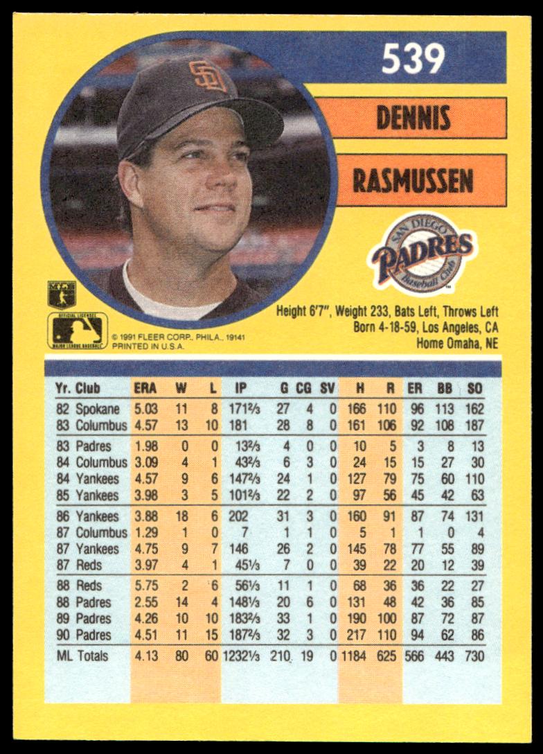 This Baseball card, from 1991 is part of the Fleer  card set. Dennis Rasmussen is featured and has a card number of 539.