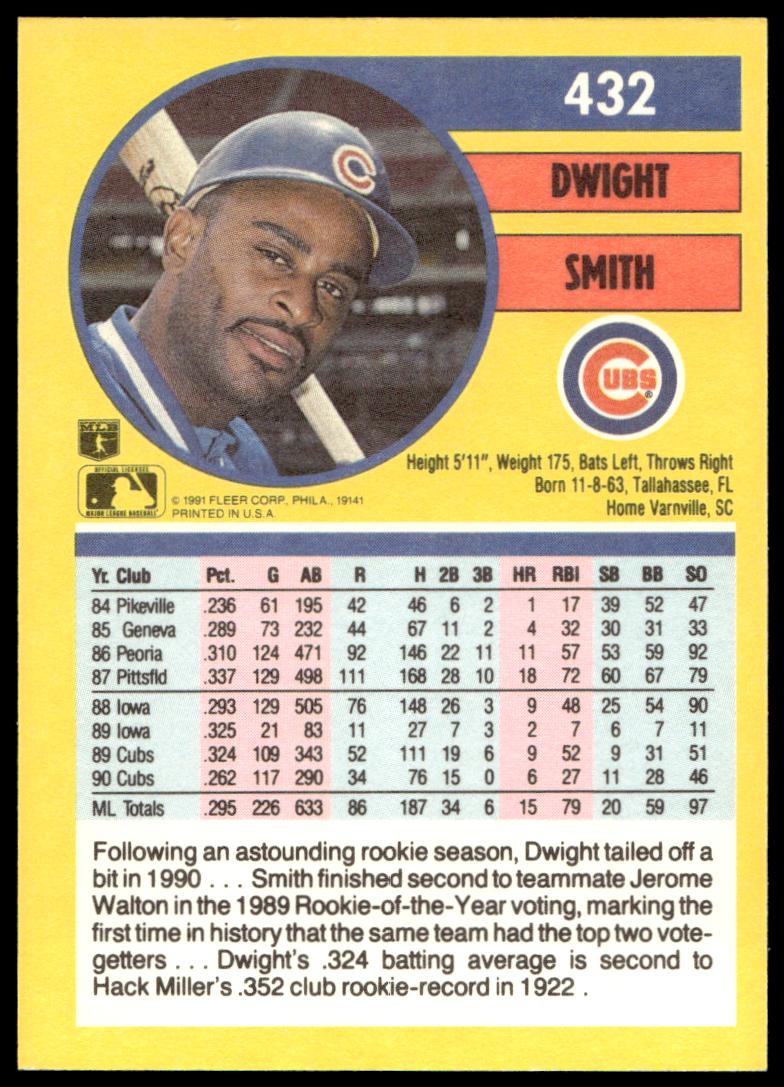 This Baseball card, from 1991 is part of the Fleer  card set. Dwight Smith is featured and has a card number of 432.