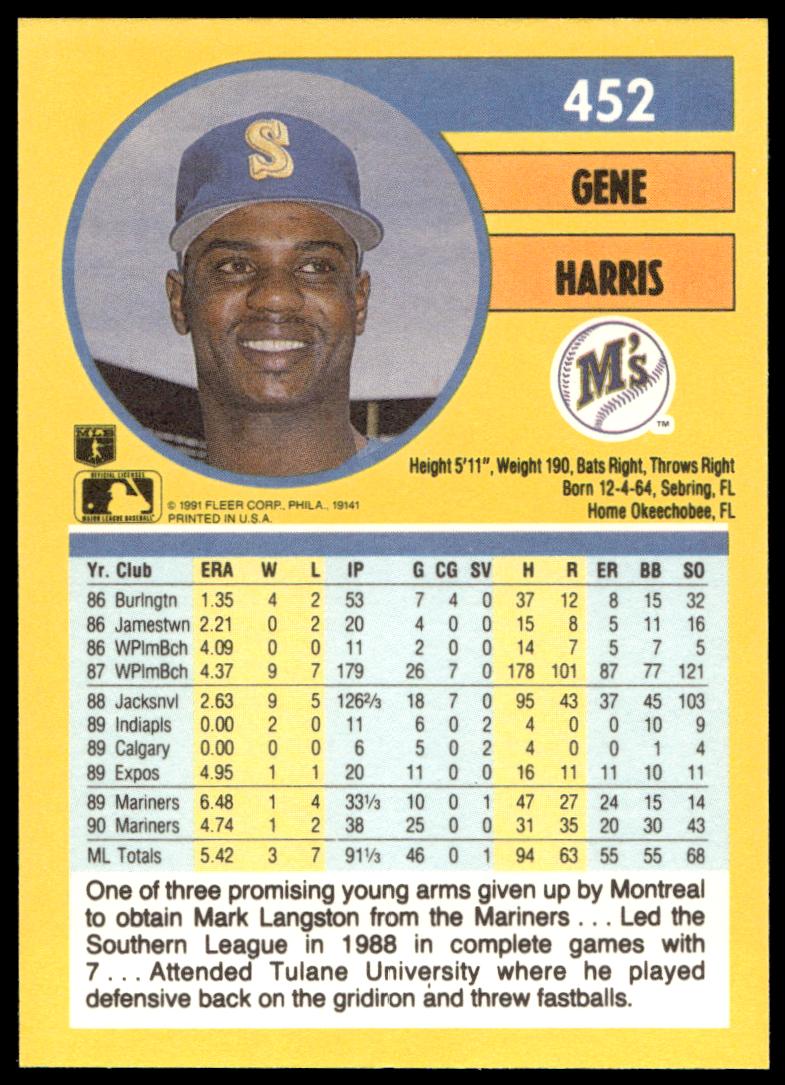 This Baseball card, from 1991 is part of the Fleer  card set. Gene Harris is featured and has a card number of 452.