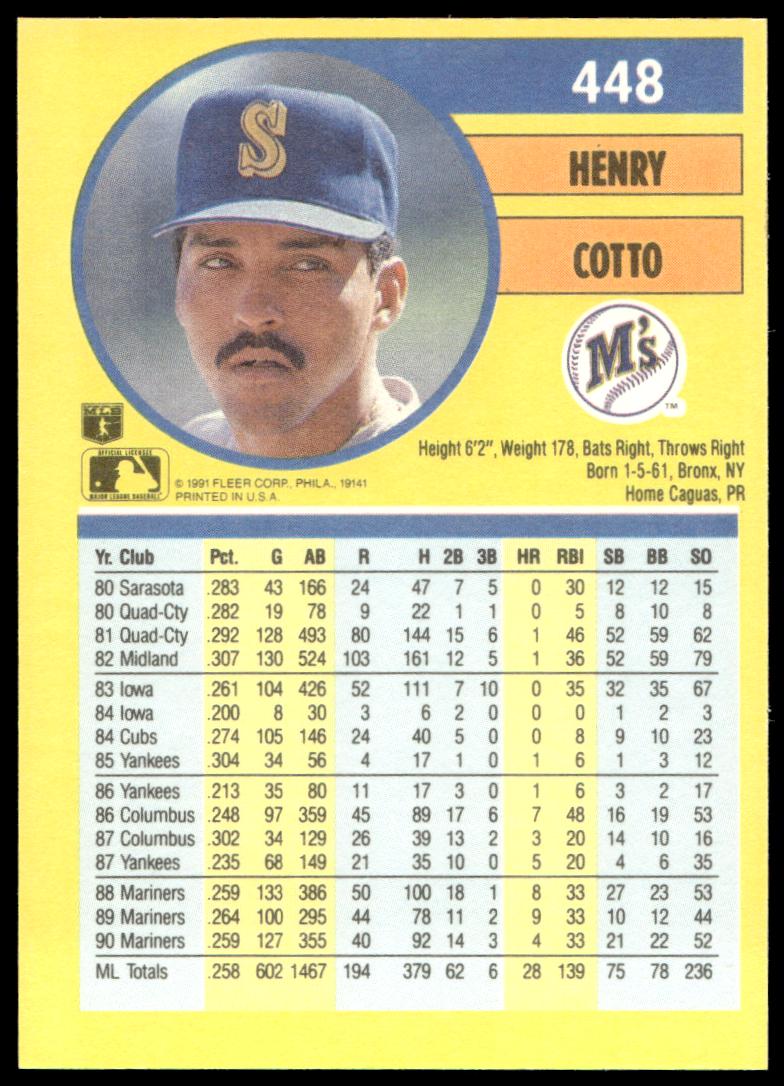 This Baseball card, from 1991 is part of the Fleer  card set. Henry Cotto is featured and has a card number of 448.