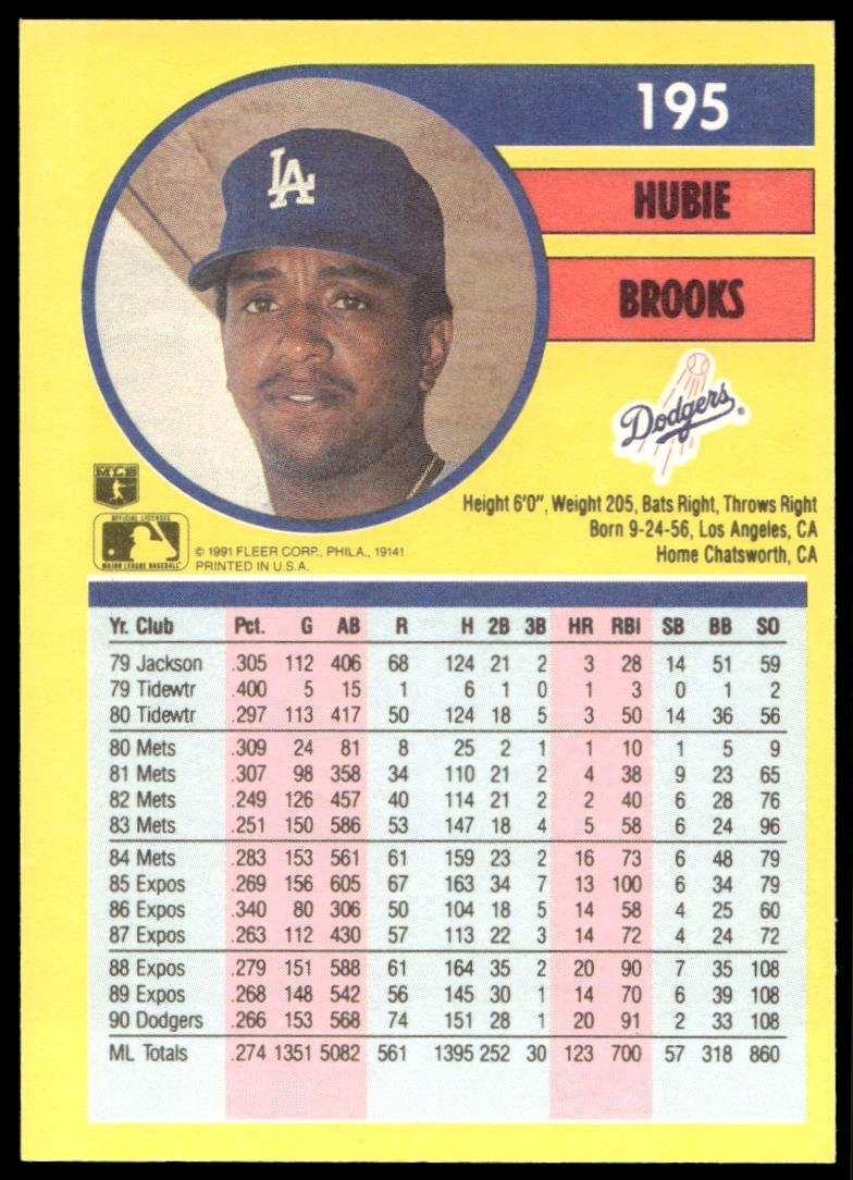 This Baseball card, from 1991 is part of the Fleer  card set. Hubie Brooks is featured and has a card number of 195.