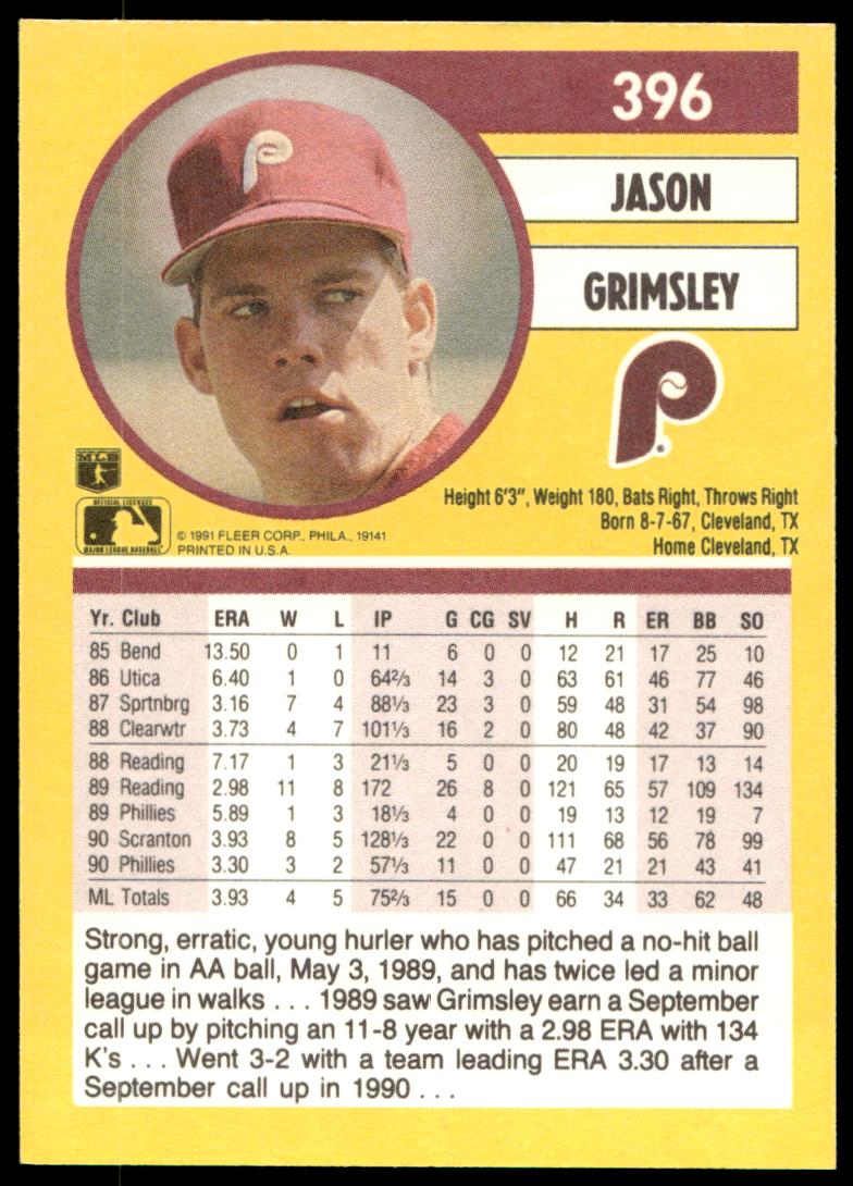 This Baseball card, from 1991 is part of the Fleer  card set. Jason Grimsley is featured and has a card number of 396.