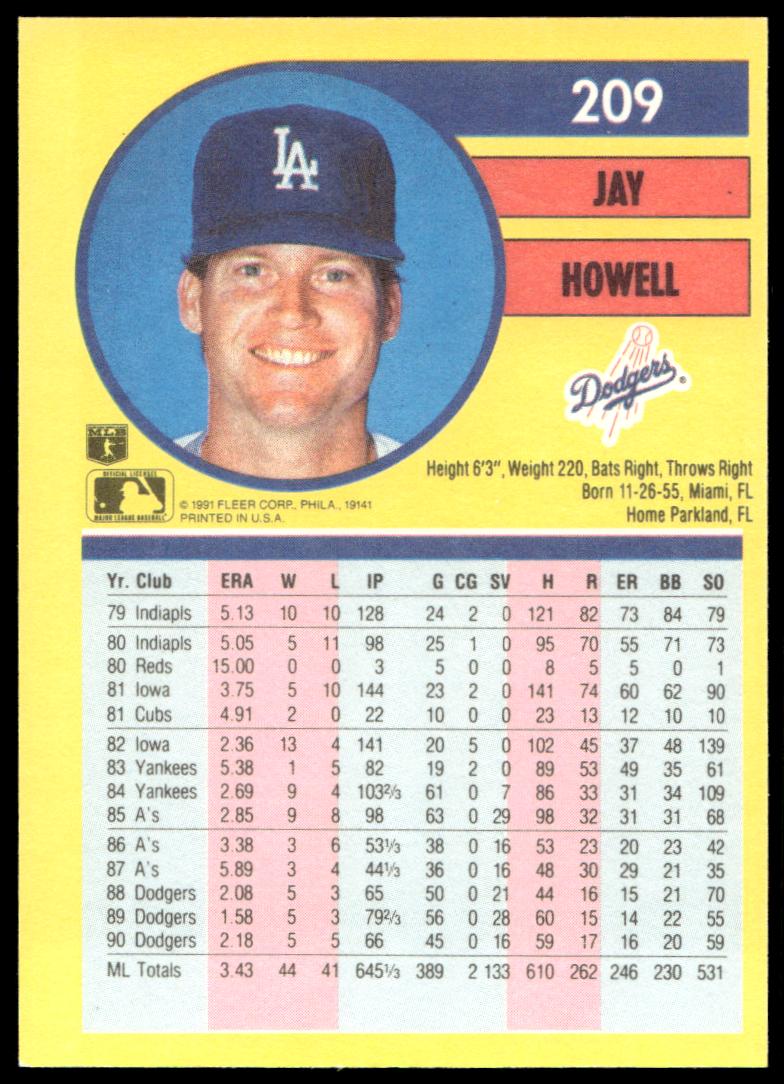 This Baseball card, from 1991 is part of the Fleer  card set. Jay Howell is featured and has a card number of 209.