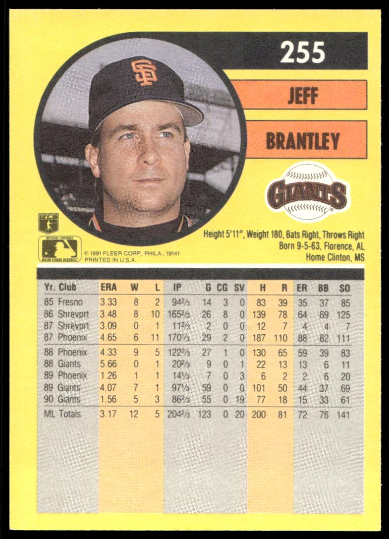 This Baseball card, from 1991 is part of the Fleer  card set. Jeff Brantley is featured and has a card number of 255.