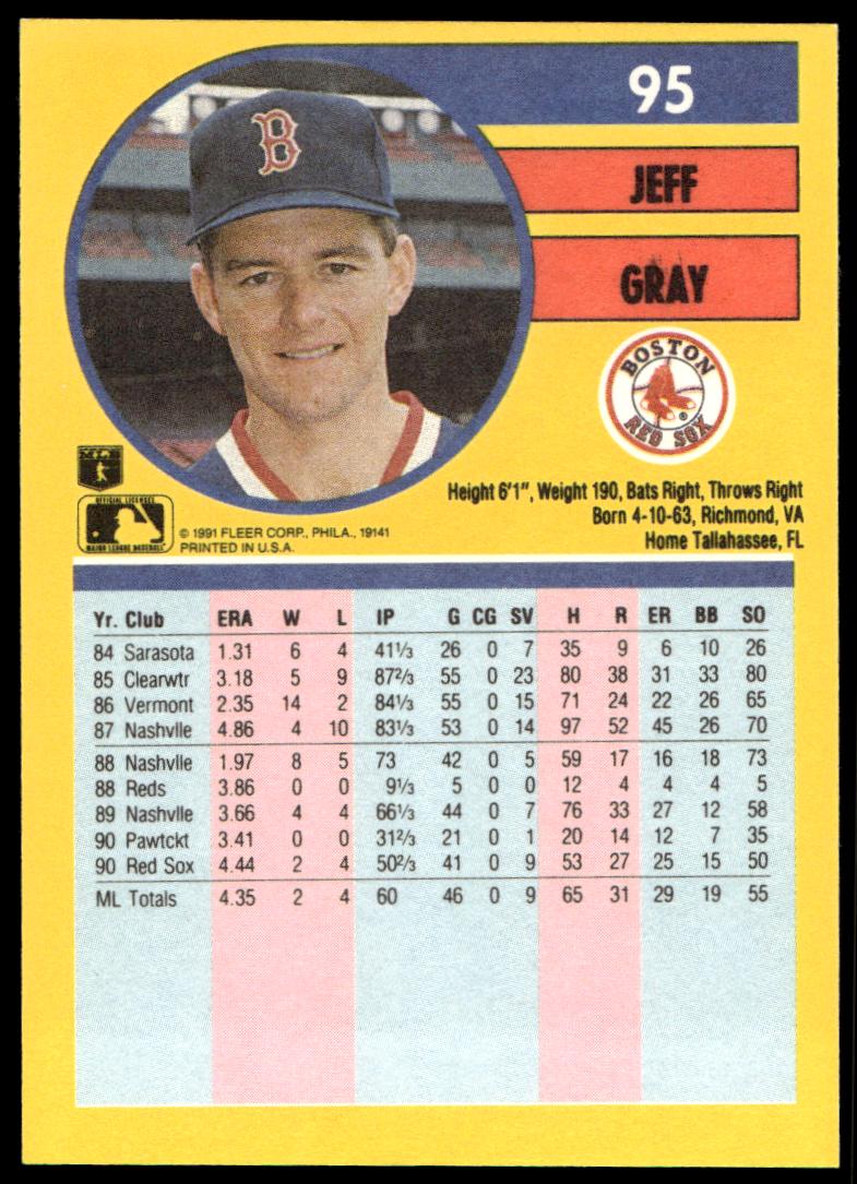 This Baseball card, from 1991 is part of the Fleer  card set. Jeff Gray is featured and has a card number of 95.