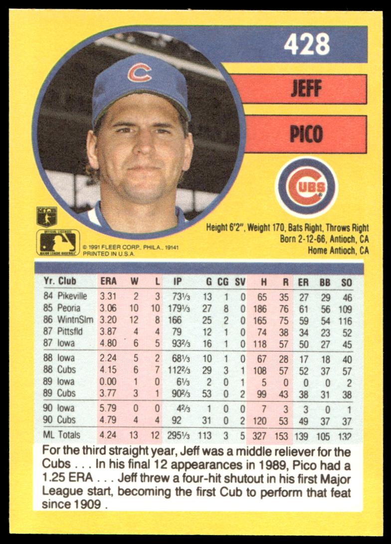This Baseball card, from 1991 is part of the Fleer  card set. Jeff Pico is featured and has a card number of 428.