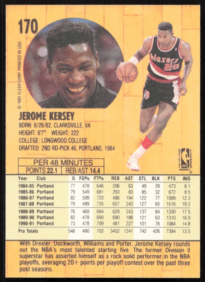 This Basketball card, from 1991 is part of the Fleer card set. Jerome Kersey is featured and has a card number of 170.
