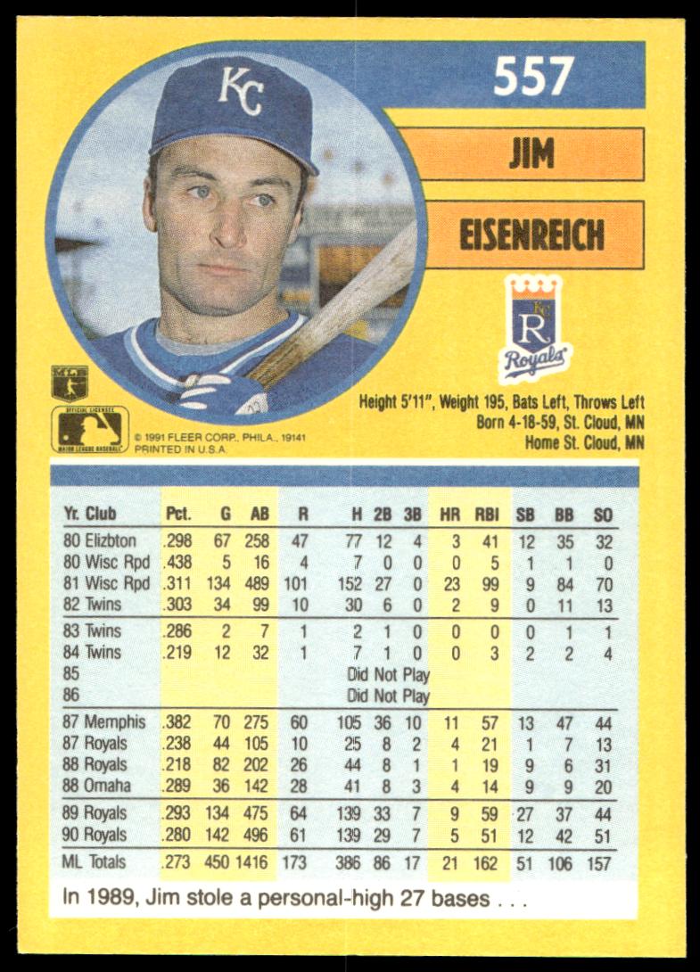 This Baseball card, from 1991 is part of the Fleer  card set. Jim Eisenreich is featured and has a card number of 557.