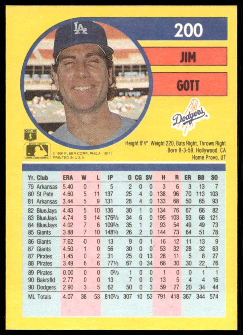 This Baseball card, from 1991 is part of the Fleer  card set. Jim Gott is featured and has a card number of 200.