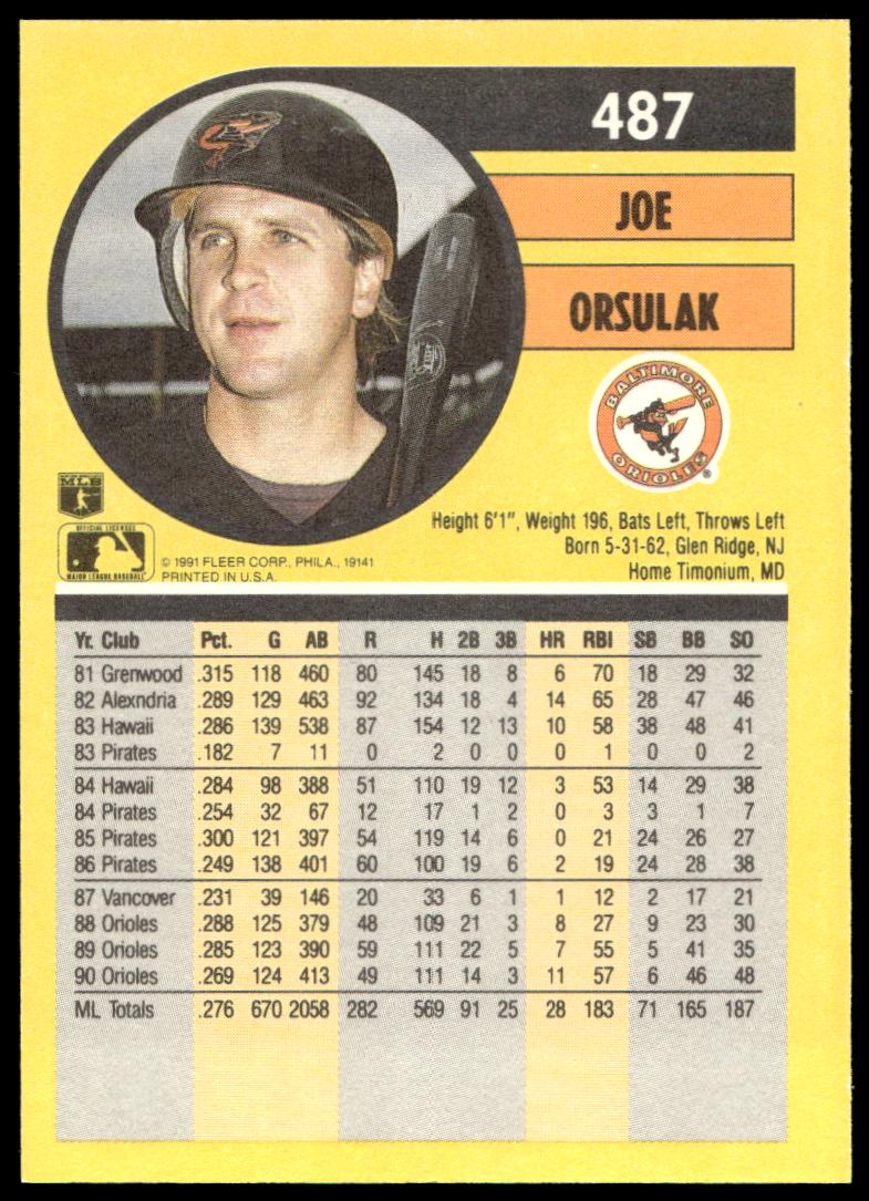 This Baseball card, from 1991 is part of the Fleer  card set. Joe Orsulak is featured and has a card number of 487.