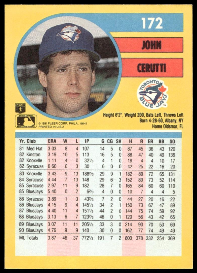 This Baseball card, from 1991 is part of the Fleer  card set. John Cerutti is featured and has a card number of 172.