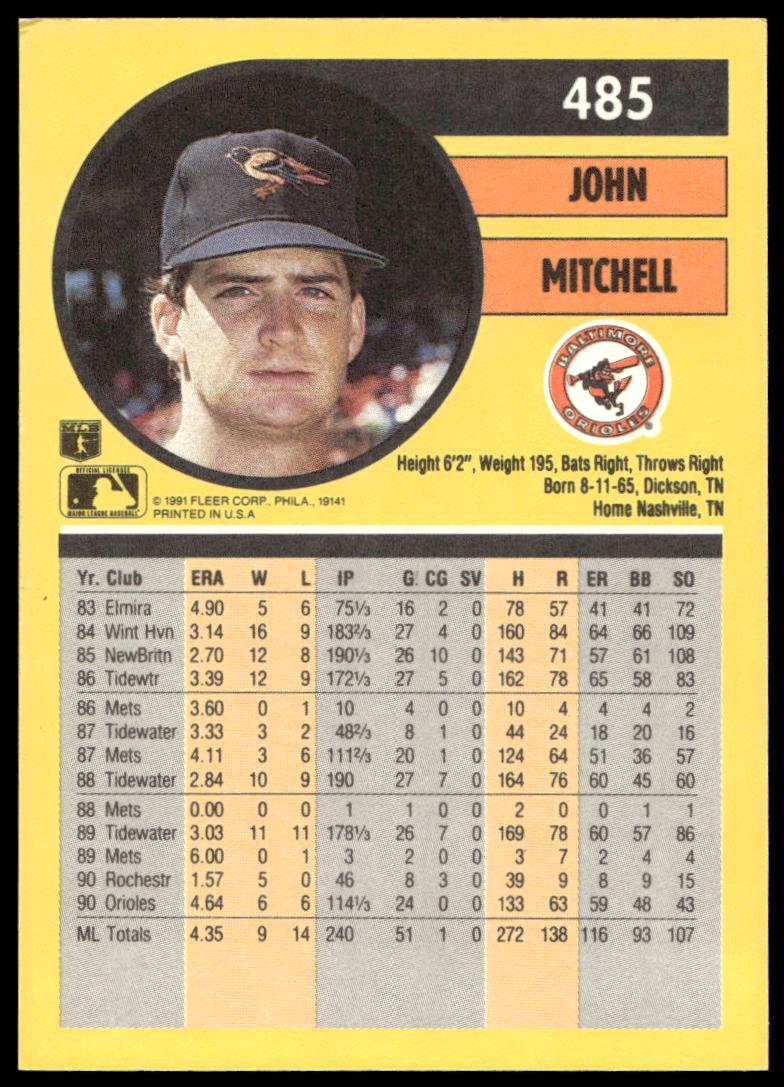 This Baseball card, from 1991 is part of the Fleer  card set. John Mitchell is featured and has a card number of 485.