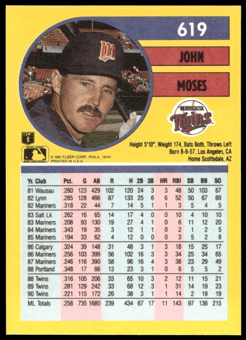 This Baseball card, from 1991 is part of the Fleer  card set. John Moses is featured and has a card number of 619.