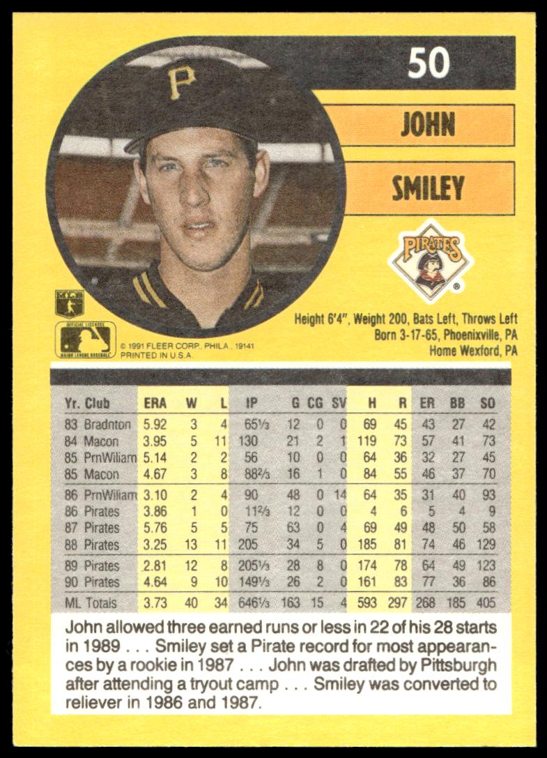 This Baseball card, from 1991 is part of the Fleer  card set. John Smiley is featured and has a card number of 50.