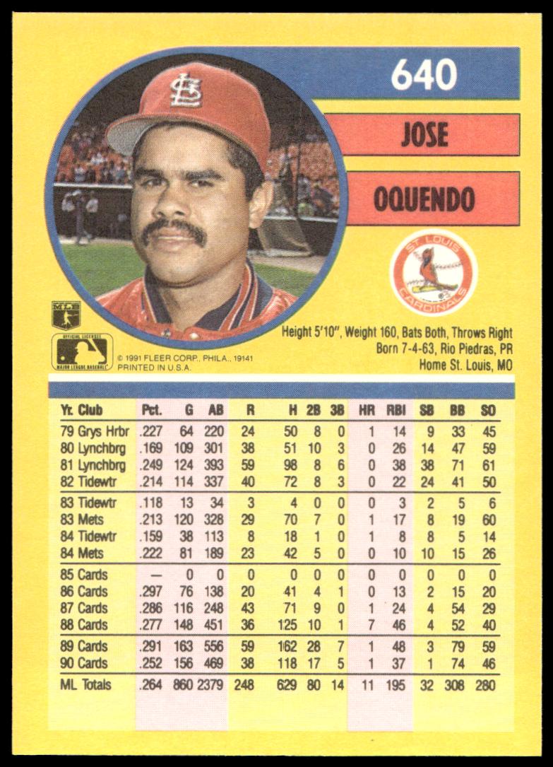 This Baseball card, from 1991 is part of the Fleer  card set. Jose Oquendo is featured and has a card number of 640.
