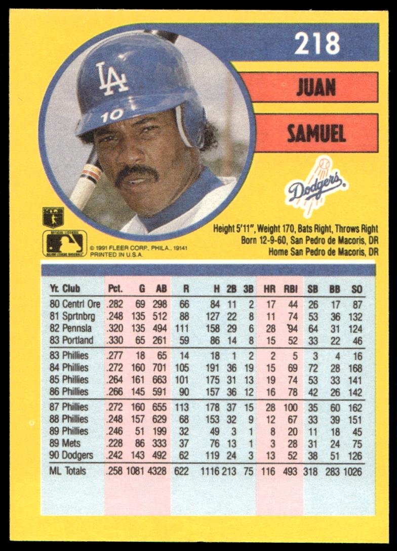 This Baseball card, from 1991 is part of the Fleer  card set. Juan Samuel is featured and has a card number of 218.