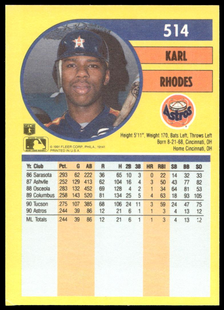 This Baseball card, from 1991 is part of the Fleer  card set. Karl Rhodes is featured and has a card number of 514.