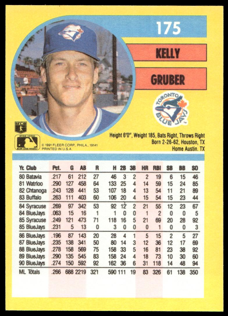 This Baseball card, from 1991 is part of the Fleer  card set. Kelly Gruber is featured and has a card number of 175.