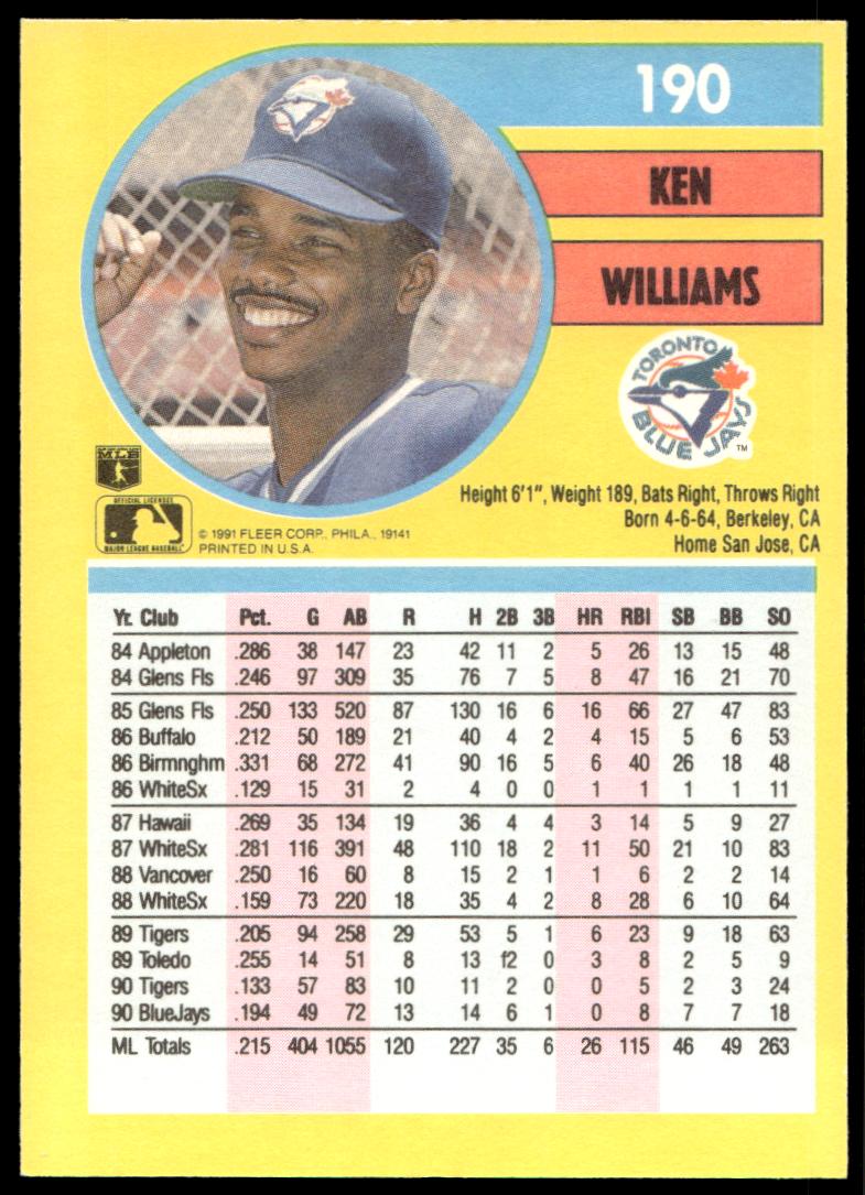 This Baseball card, from 1991 is part of the Fleer  card set. Ken Williams is featured and has a card number of 190.
