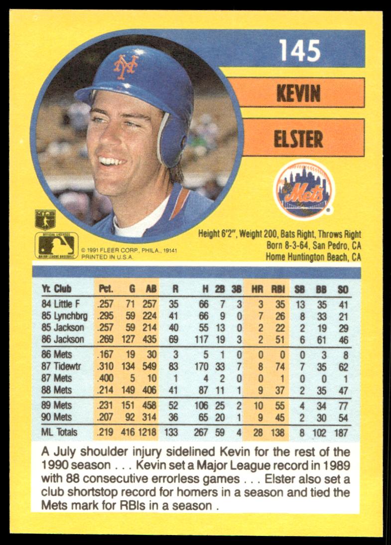 This Baseball card, from 1991 is part of the Fleer  card set. Kevin Elster is featured and has a card number of 145.