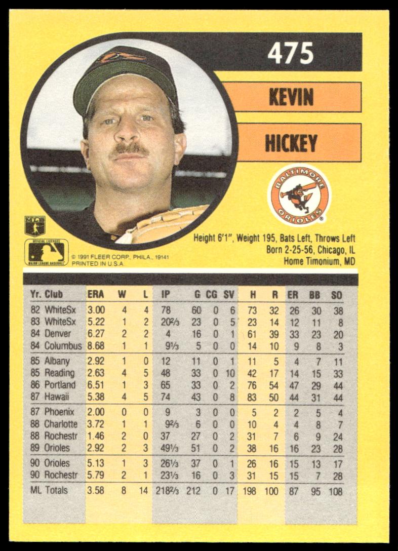 This Baseball card, from 1991 is part of the Fleer  card set. Kevin Hickey is featured and has a card number of 475.