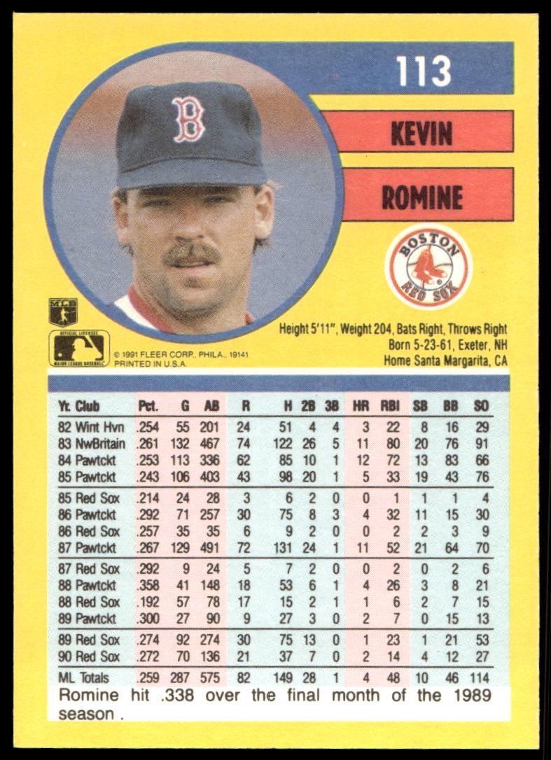 This Baseball card, from 1991 is part of the Fleer  card set. Kevin Romine is featured and has a card number of 113.