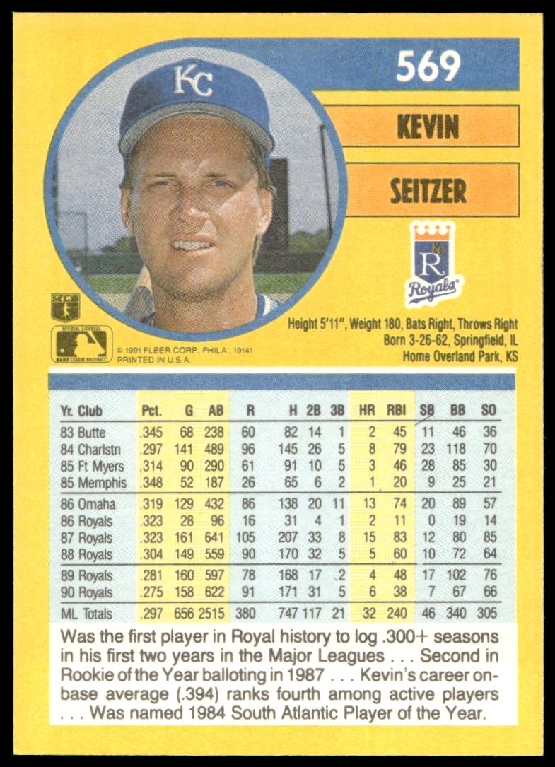 This Baseball card, from 1991 is part of the Fleer  card set. Kevin Seitzer is featured and has a card number of 569.