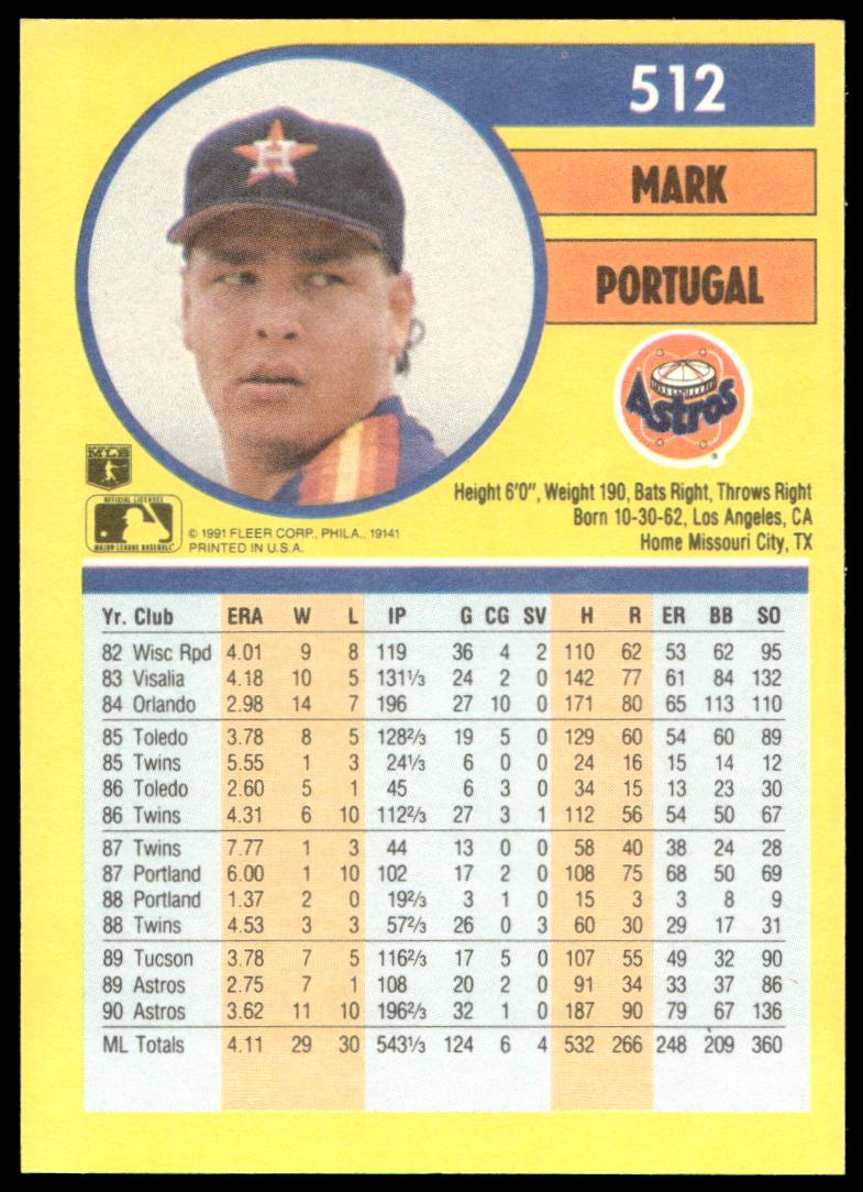 This Baseball card, from 1991 is part of the Fleer  card set. Mark Portugal is featured and has a card number of 512.