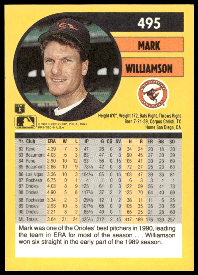 This Baseball card, from 1991 is part of the Fleer  card set. Mark Williamson is featured and has a card number of 495.
