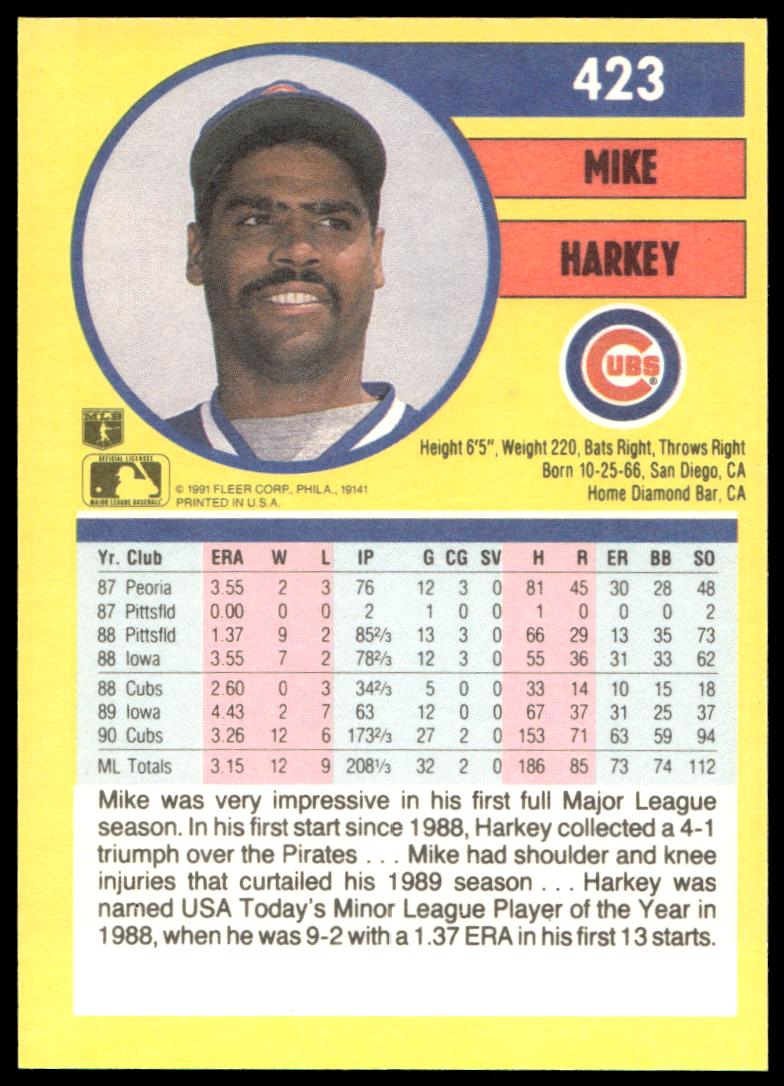 This Baseball card, from 1991 is part of the Fleer  card set. Mike Harkey is featured and has a card number of 423.