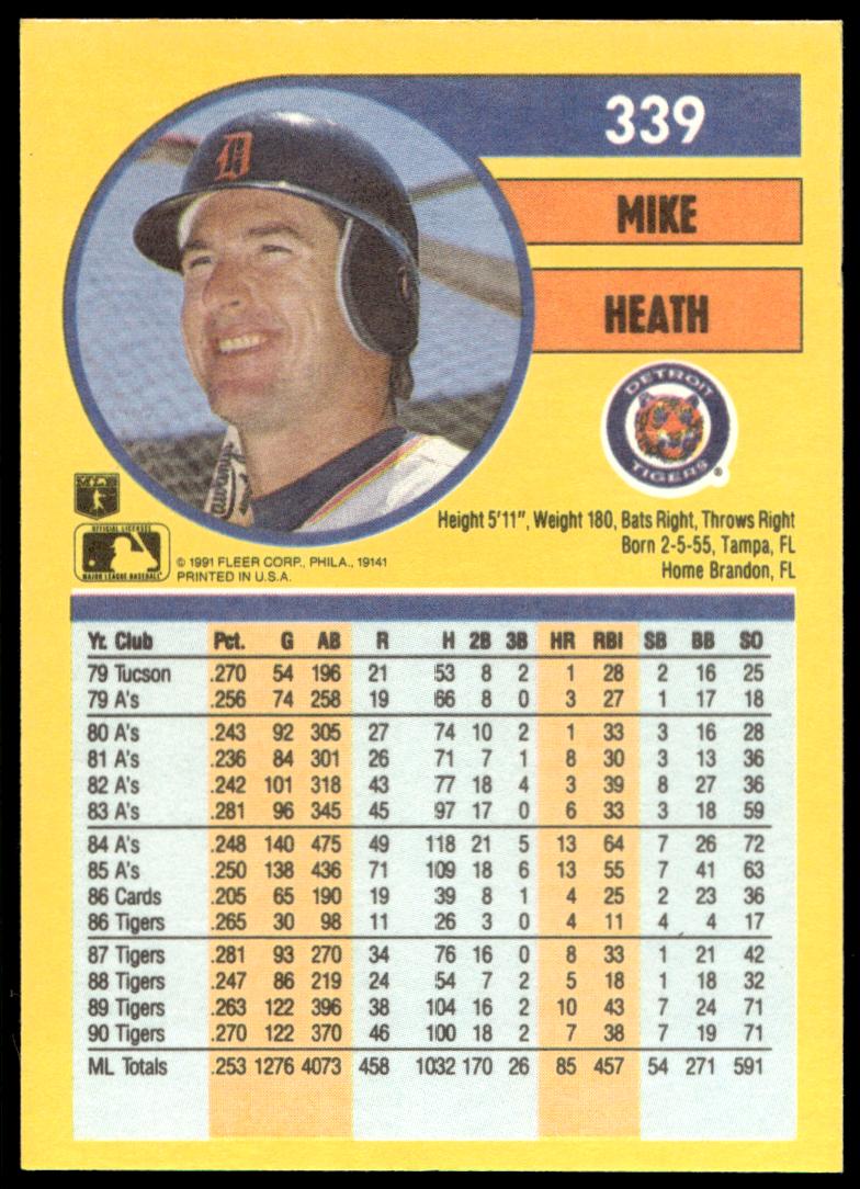 This Baseball card, from 1991 is part of the Fleer  card set. Mike Heath is featured and has a card number of 339.