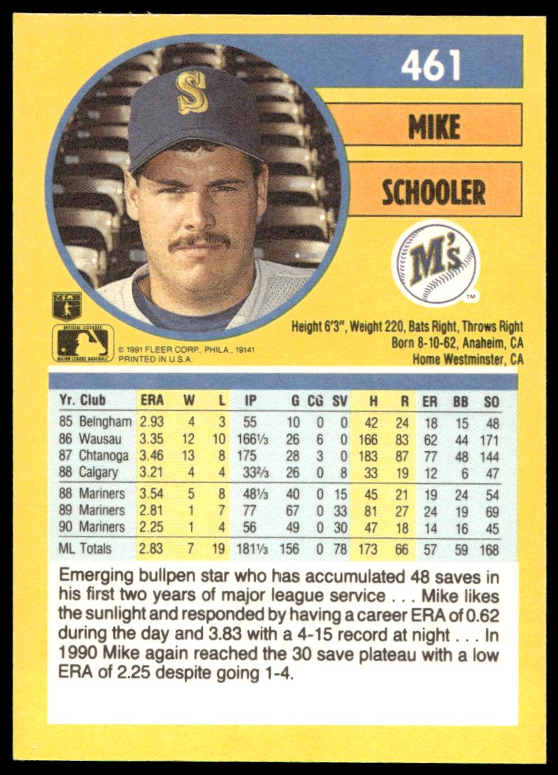 This Baseball card, from 1991 is part of the Fleer  card set. Mike Schooler is featured and has a card number of 461.