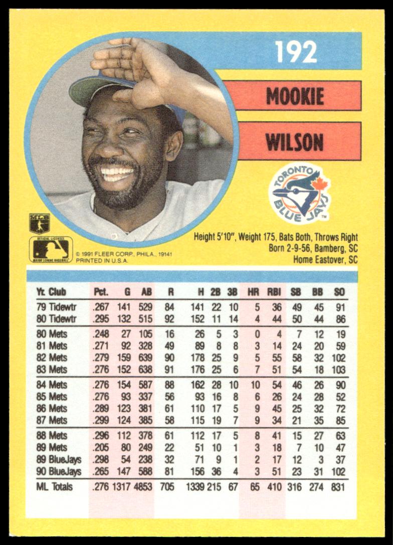 This Baseball card, from 1991 is part of the Fleer  card set. Mookie Wilson is featured and has a card number of 192.