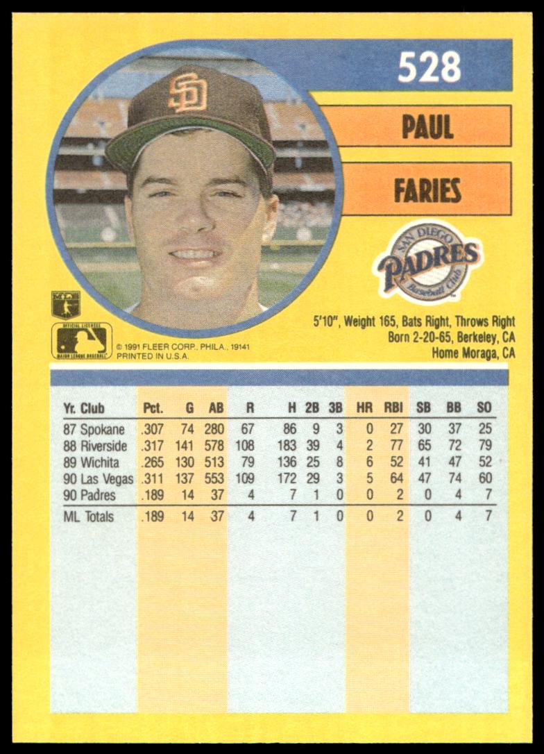 This Baseball card, from 1991 is part of the Fleer  card set. Paul Faries is featured and has a card number of 528.