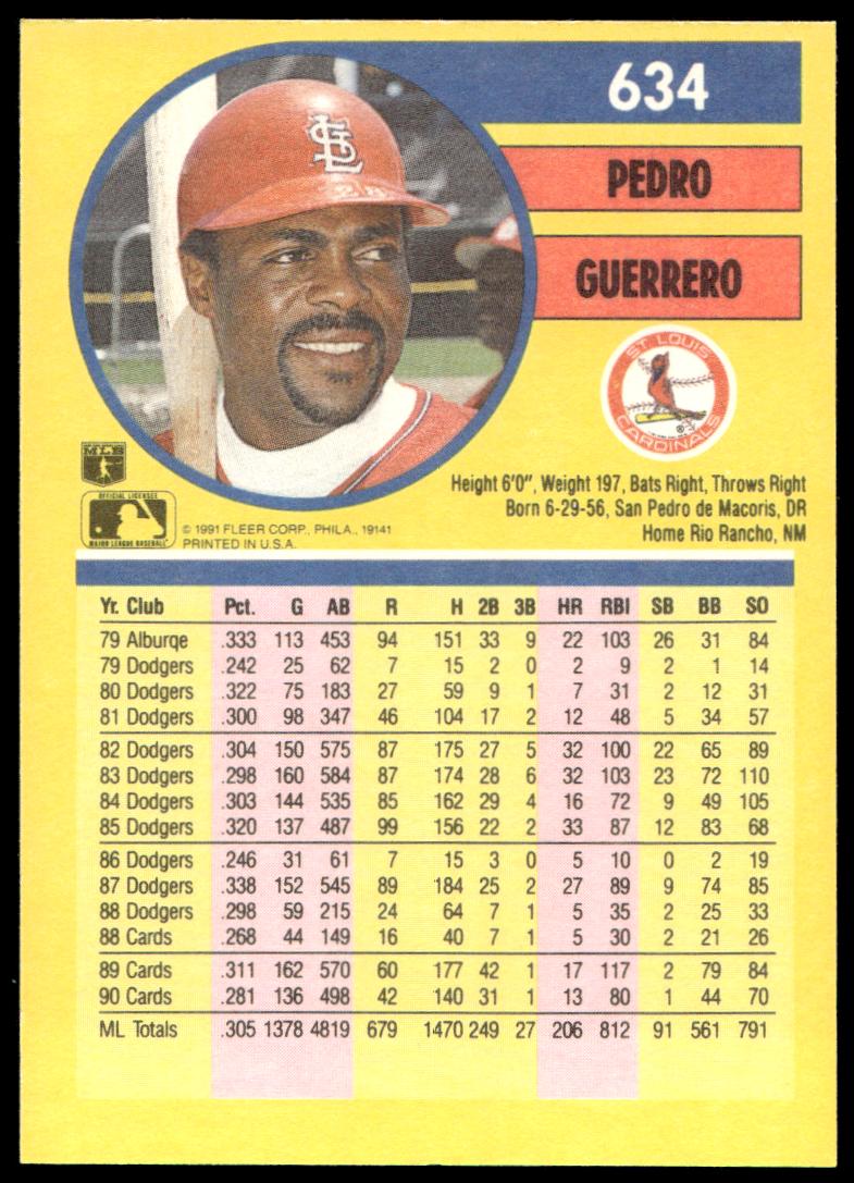 This Baseball card, from 1991 is part of the Fleer  card set. Pedro Guerrero is featured and has a card number of 634.