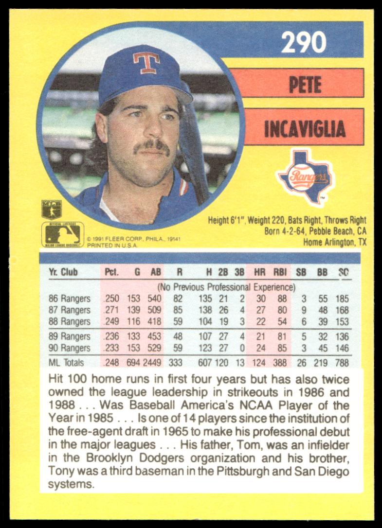 This Baseball card, from 1991 is part of the Fleer  card set. Pete Incaviglia is featured and has a card number of 290.