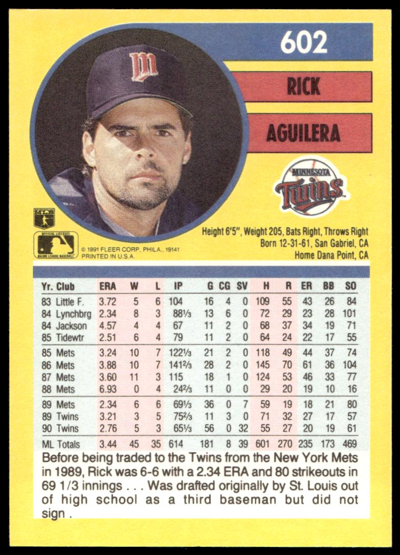 This Baseball card, from 1991 is part of the Fleer  card set. Rick Aguilera is featured and has a card number of 602.