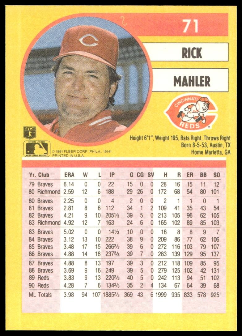 This Baseball card, from 1991 is part of the Fleer  card set. Rick Mahler is featured and has a card number of 71.