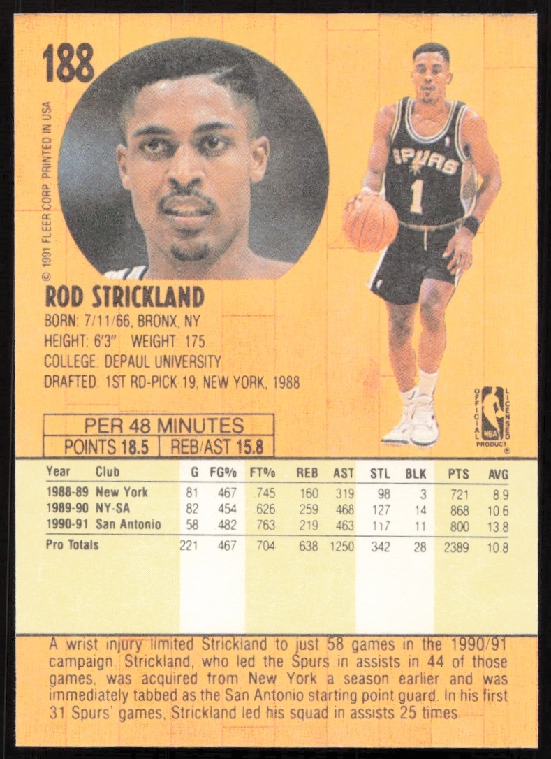 This Basketball card, from 1991 is part of the Fleer card set. Rod Strickland is featured and has a card number of 188.