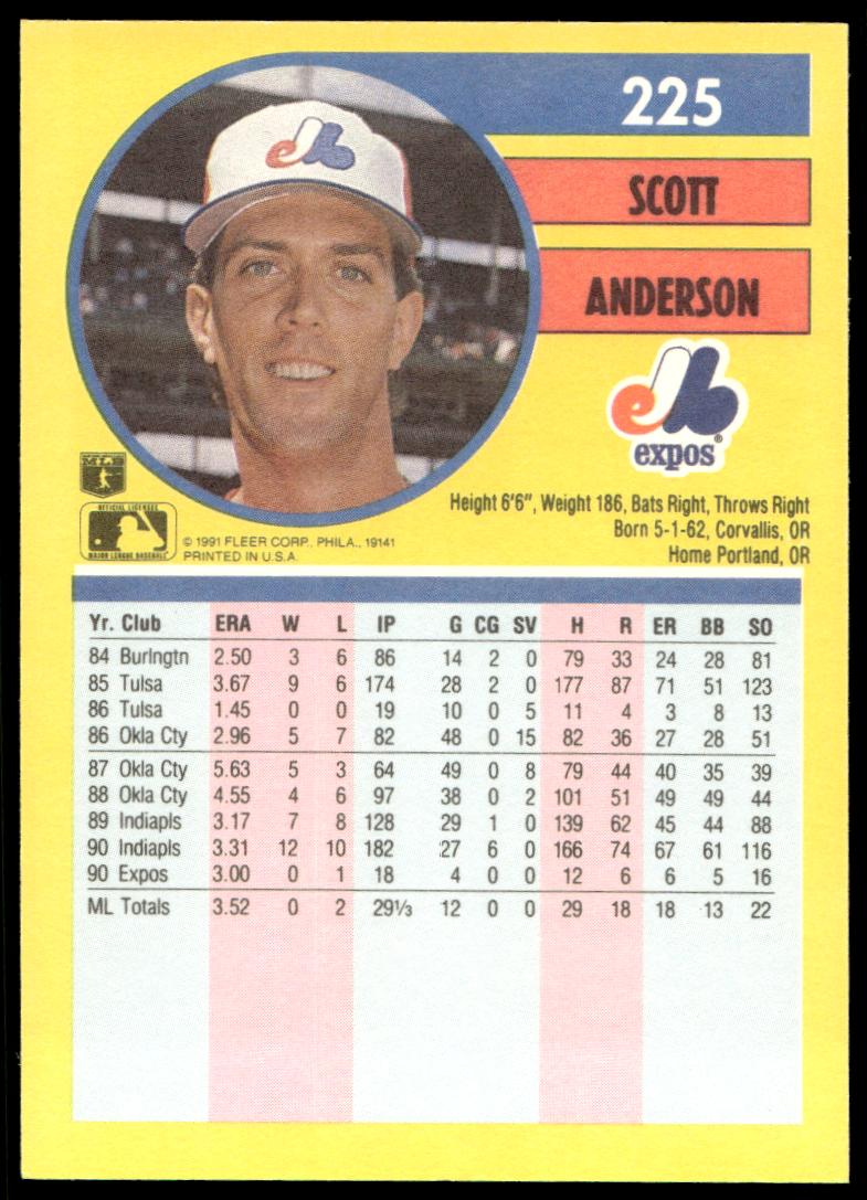 This Baseball card, from 1991 is part of the Fleer  card set. Scott Anderson is featured and has a card number of 225.