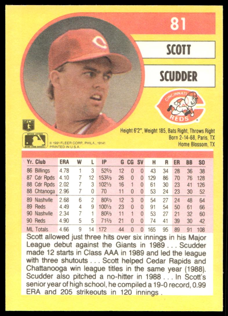 This Baseball card, from 1991 is part of the Fleer  card set. Scott Scudder is featured and has a card number of 81.