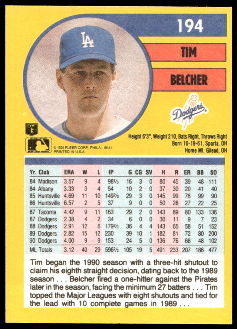 This Baseball card, from 1991 is part of the Fleer  card set. Tim Belcher is featured and has a card number of 194.