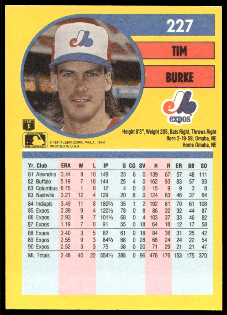 This Baseball card, from 1991 is part of the Fleer  card set. Tim Burke is featured and has a card number of 227.