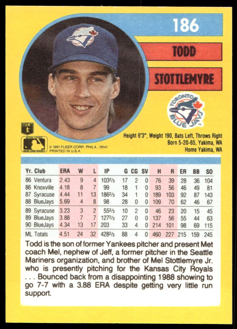 This Baseball card, from 1991 is part of the Fleer  card set. Todd Stottlemyre is featured and has a card number of 186.