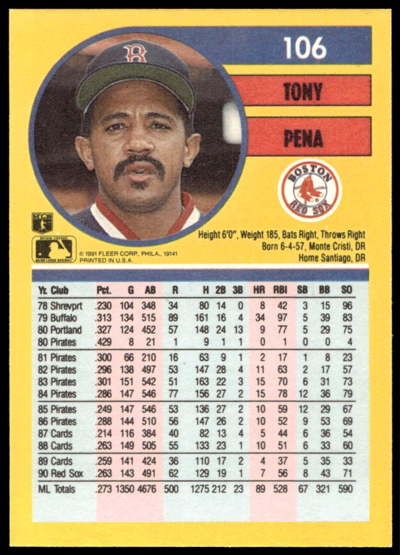 This Baseball card, from 1991 is part of the Fleer  card set. Tony Pena is featured and has a card number of 106.